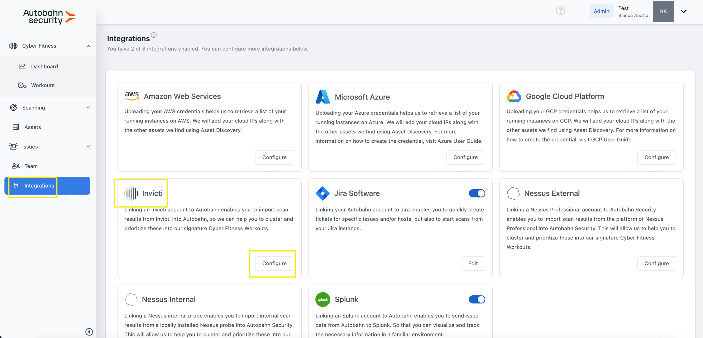 1 – Sign into your Autobahn account and on the side menu, click Integrations. Click on the Configure button on the Invicti card.