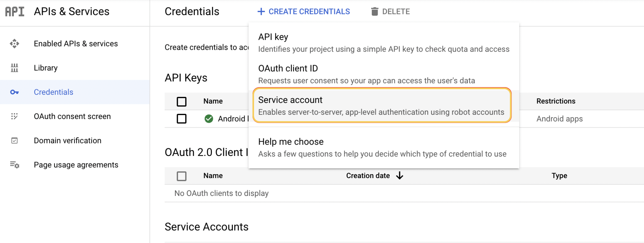 3 – Click the + CREATE CREDENTIALS button and choose Service account.